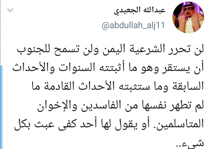 وقال الجعيدي عبر تغريدة له على "تويتر" رصدها "المشهد العربي": "لن تحرر الشرعية اليمن ولن تسمح للجنوب بأن يستقر وهو ما أثبتته السنوات والأحداث السابقة وما ستثبته الأحداث القادمة ما لم تطهر نفسها من الفاسدين والإخوان المتأسلمين، أو يقول لها أحد كفى عبثا بكل شيء".