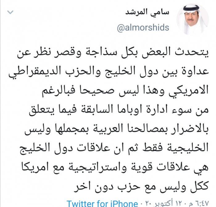 وأضاف المرشد: "بالرغم من سوء إدارة أوباما السابقة فيما يتعلق بالأضرار بمصالحنا العربية بمجملها وليس الخليجية فقط ثم إن علاقات دول الخليج هي علاقات قوية واستراتيجية مع أمريكا ككل وليس مع حزب دون آخر".