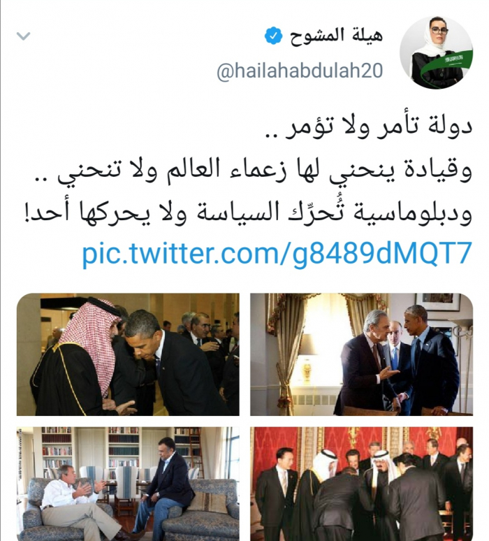 وكتبت المشوح عبر حسابها بتويتر رصدها " المشهد العربي": "دولة تأمر ولا تؤمر .. وقيادة ينحني لها زعماء العالم ولا تنحني .. ودبلوماسية تُُحرِّك السياسة ولا يحركها أحد".
