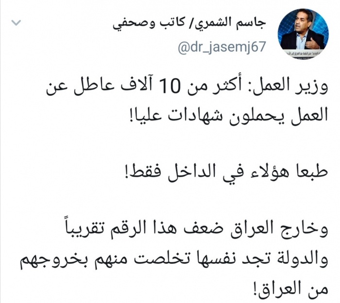 واستشهد الشمري في تغريدة له عبر حسابه بتويتر ورصدها "المشهد العربي" بتصريح وزير العمل الذي قال فيه: أكثر من 10 آلاف عاطل عن العمل يحملون شهادات عليا".