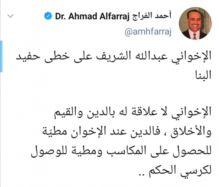 وقال الفراج عبر تغريدة له على حسابه بتويتر ورصدها "المشهد العربي" : "الإخواني عبدالله الشريف على خطى حفيد البنا".