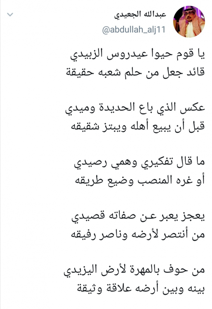 كتب الشاعر عبد الله الجعيدي، أبياتا في حب رئيس المجلس الانتقالي الجنوبي عيدروس الزُبيدي.