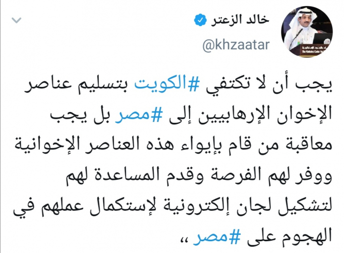 وقال الزعتر عبر تغريدة له على "تويتر" رصدها "المشهد العربي": "يجب أن لا تكتفي الكويت بتسليم عناصر الإخوان الإرهابيين إلى مصر بل يجب معاقبة من قام بإيواء هذه العناصر الإخوانية ووفر لهم الفرصة وقدم المساعدة لهم لتشكيل لجان إلكترونية لإستكمال عملهم في الهجوم على مصر".