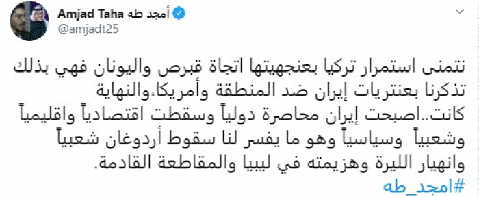 وقال في تغريدة عبر "تويتر" رصدها "المشهد العربي": "نتمنى استمرار تركيا بعنجهيتها اتجاة قبرص واليونان فهي بذلك تذكرنا بعنتريات إيران ضد المنطقة وأمريكا،والنهاية كانت.. أصبحت إيران محاصرة دولياً وسقطت اقتصادياً واقليمياً وشعبياً وسياسياً وهو ما يفسر لنا سقوط أردوغان شعبياً وانهيار الليرة وهزيمته في ليبيا والمقاطعة القادمة".