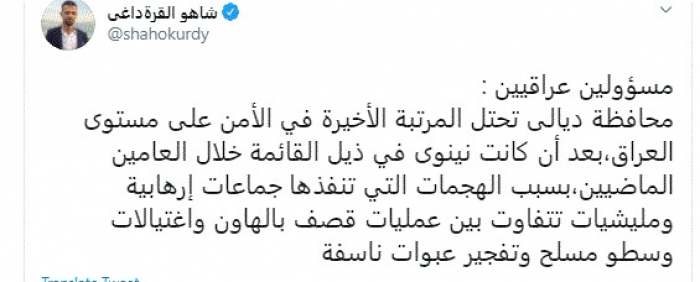 وقال في تغريدة عبر "تويتر" رصدها "المشهد العربي": "مسؤولين عراقيين: محافظة ديالى تحتل المرتبة الأخيرة في الأمن على مستوى العراق،بعد أن كانت نينوى في ذيل القائمة خلال العامين الماضيين ،بسبب الهجمات التي تنفذها جماعات إرهابية ومليشيات تتفاوت بين عمليات قصف بالهاون واغتيالات وسطو مسلح وتفجير عبوات ناسفة".