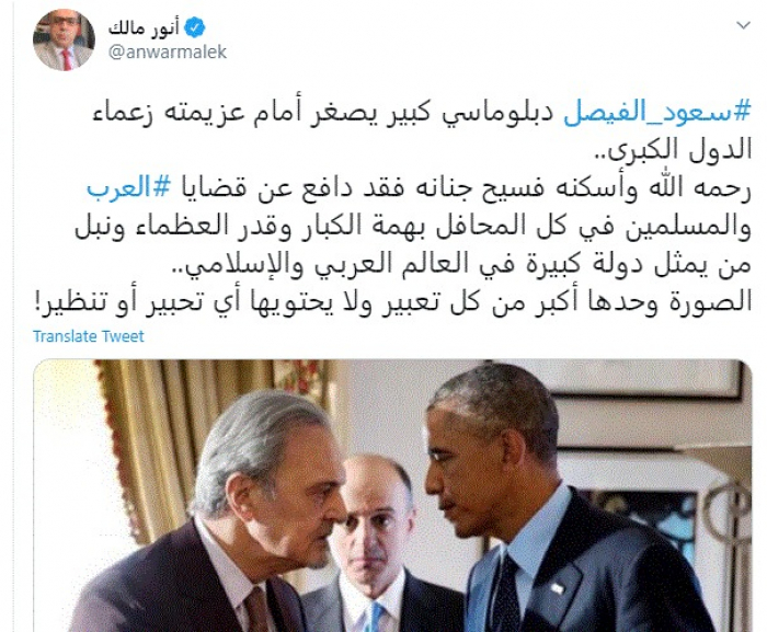 وقال في تغريدة عبر "تويتر" رصدها "المشهد العربي": "سعود الفيصل دبلوماسي كبير يصغر أمام عزيمته زعماء الدول الكبرى.. رحمه الله وأسكنه فسيح جنانه فقد دافع عن قضايا العرب والمسلمين في كل المحافل بهمة الكبار وقدر العظماء ونبل من يمثل دولة كبيرة في العالم العربي والإسلامي.. الصورة وحدها أكبر من كل تعبير ولا يحتويها أي تحبير أو تنظير".