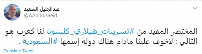 وقال في تغريدة عبر "تويتر" رصدها "المشهد العربي": "المختصر المفيد من تسريبات هيلاري كلينتون لنا كعرب هو التالي: لا خوف علينا مادام هناك دولة اسمها السعودية".