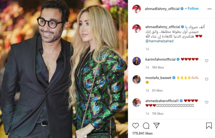 ونشر فهمي، صورة له مع هنا عبر حسابه بموقع "إنستجرام"، معلّقا: "ألف مبروك يا حبيبتي أول بطولة مطلقة.. واثق إنك هتكسري الدنيا كالعادة إن شاء الله".