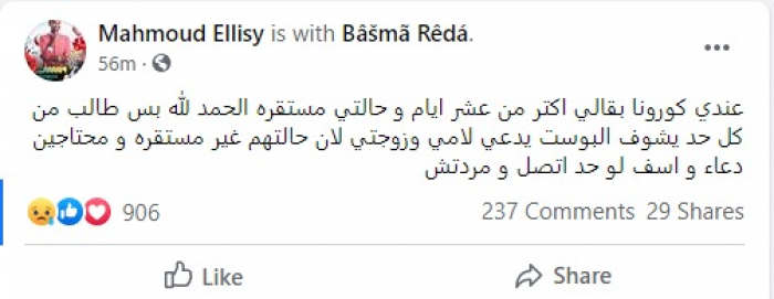وكتب الليثي عبر حسابه الشخصي على موقع التواصل الاجتماعي فيس بوك: «عندي كورونا بقالي اكتر من عشر أيام و حالتي مستقرة الحمد لله بس طالب من كل حد يشوف البوست يدعي لامي وزوجتي لإن حالتهم غير مستقره و محتاجين دعاء وأسف لو حد اتصل و مردتش».