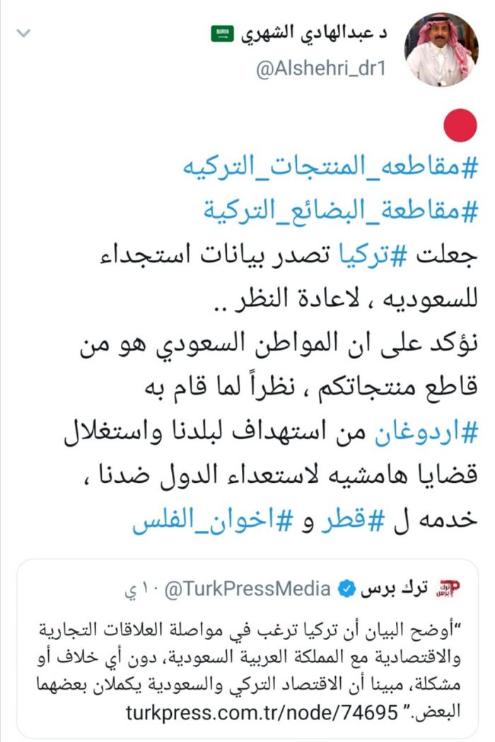 وقال الشهري في تغريدة له عبر حسابه بتويتر ورصدها "المشهد العربي": "#مقاطعة_البضائع_التركية جعلت تركيا تصدر بيانات استجداء للسعودية، لإعادة النظر".