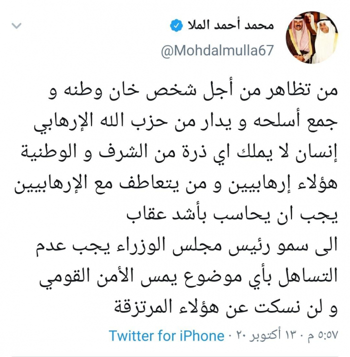 وكتب أحمد الملا عبر تغريدة له على "تويتر" رصدها " المشهد العربي": من تظاهر من أجل شخص خان وطنه و جمع أسلحة و يدار من حزب الله الإرهابي إنسان لا يملك اي ذرة من الشرف و الوطنية".