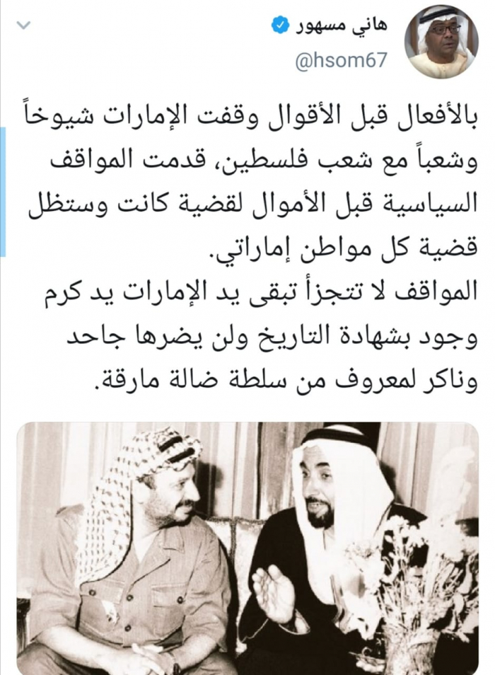 وكتب مسهور في تغريدة له على "تويتر" رصدها " المشهد العربي":"بالأفعال قبل الأقوال وقفت الإمارات شيوخاً وشعباً مع شعب فلسطين، قدمت المواقف السياسية قبل الأموال لقضية كانت وستظل قضية كل مواطن إماراتي".