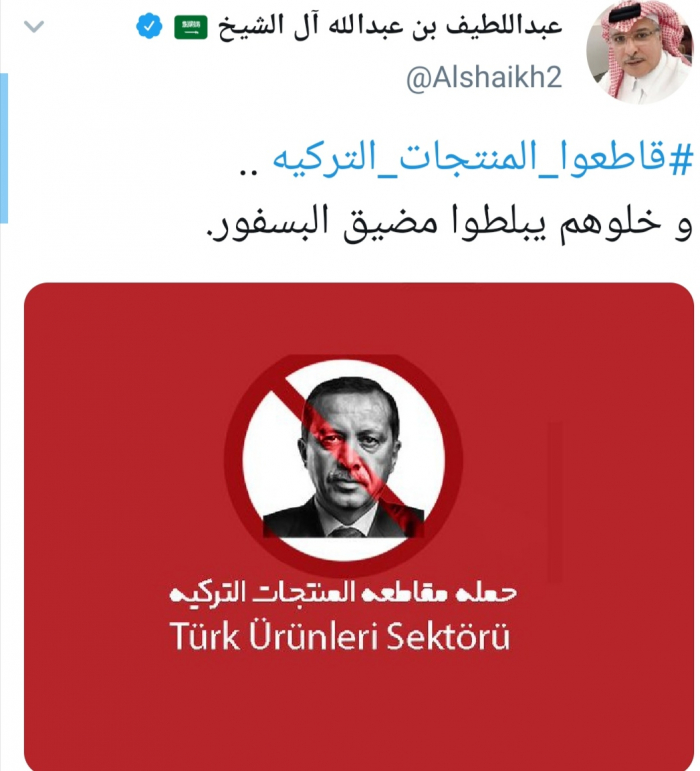 وكتب "أل شيخ" تغريدة عبر تويتر، رصدها "المشهد العربي": "#قاطعواالمنتجاتالتركيه.. وخلوهم يبلطوا مضيق البسفور".