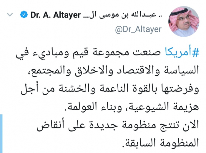 وغرد الطاير على حسابه بتويتر ورصدها "المشهد العربي" :"أمريكا صنعت مجموعة قيم ومباديء في السياسة والاقتصاد والأخلاق والمجتمع، وفرضتها بالقوة الناعمة والخشنة من أجل هزيمة الشيوعية، وبناء العولمة".