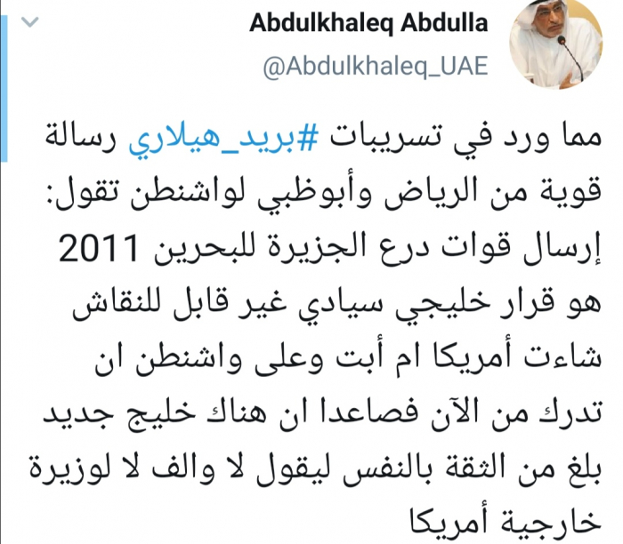 وكتب عبدالله في تغريدة له عبر حسابه بتويتر ورصدها "المشهد العربي" يقول: " مما ورد في تسريبات #بريد_هيلاري رسالة قوية من الرياض وأبوظبي لواشنطن تقول: إرسال قوات درع الجزيرة للبحرين 2011 هو قرار خليجي سيادي غير قابل للنقاش شاءت أمريكا أم أبت".