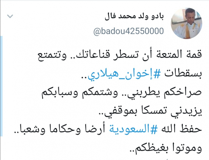 وقال ولد محمد في تغريدة عبر "تويتر" رصدها "المشهد العربي" : "قمة المتعة أن تسطر قناعاتك.. وتتمتع بسقطات إخوان هيلاري".