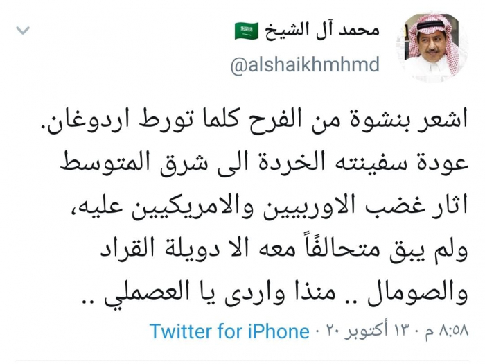 وقال آل الشيخ في تغريدة له عبر "تويتر" رصدها "المشهد العربي": "أشعر بنشوة من الفرح كلما تورط أردوغان، عودة سفينته الخردة إلى شرق المتوسط أثار غضب الأوربيين والأمريكيين عليه".
