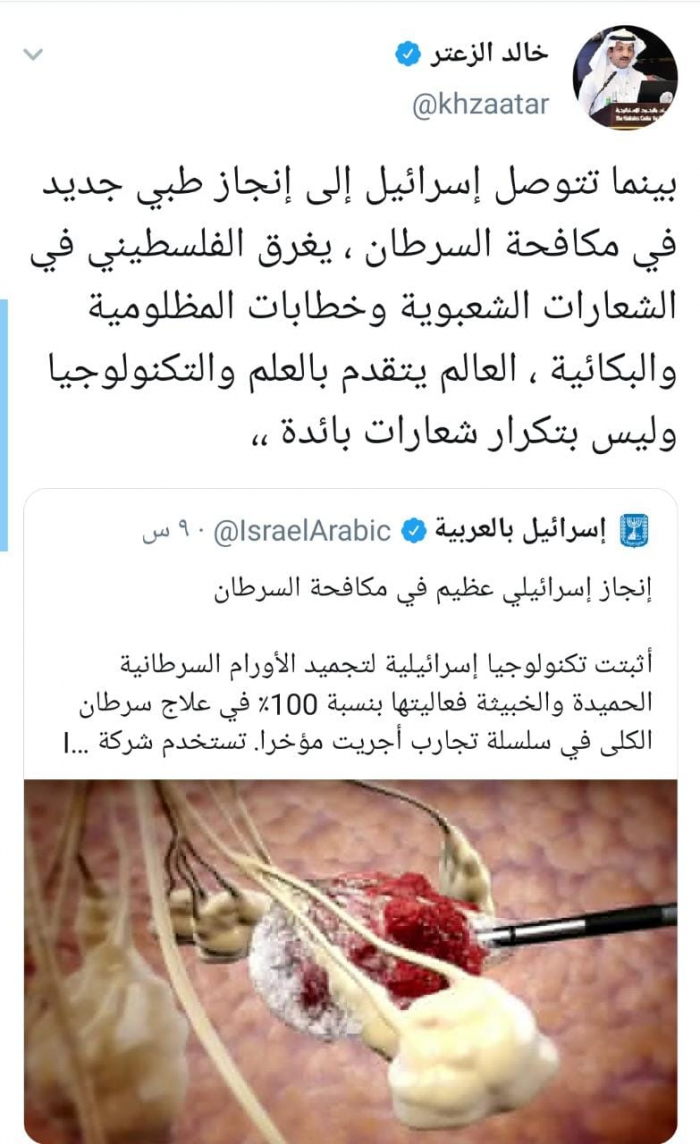وكتب الزعتر عبر تغريدة له على "تويتر" رصدها "المشهد العربي": "بينما تتوصل إسرائيل إلى إنجاز طبي جديد في مكافحة السرطان ، يغرق الفلسطيني في الشعارات الشعبوية وخطابات المظلومية والبكائية".