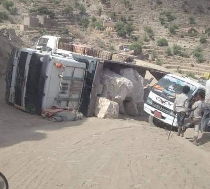 انقلاب شاحنة يُعطل حركة طريق هيجة العبد بتعز