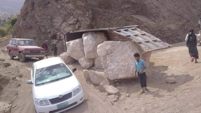 وقالت مصادر محلية لـ"المشهد العربي"، إن الحمولة المرتفعة هي سبب انقلاب الشاحنة التي كانت تحمل الحجارة في أحد المنعطفات، مشيرةً إلى أن هناك جهودًا تبذل لفتح الطريق الحيوي الذي يعد المنفذ الوحيد لتعز.