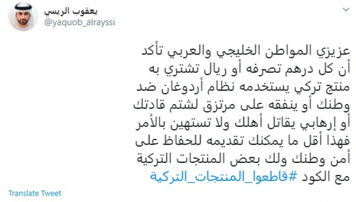 طالب الكاتب الإماراتي يعقوب الريسي، اليوم، العرب بمقاطعة المنتجات التركية للحفاظ على أمن المنطقة.