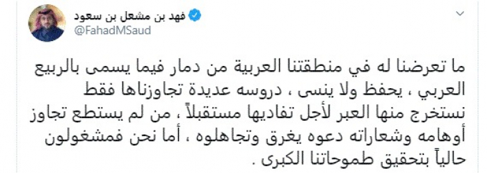 طالب الأمير السعودي البارز فهد بن مشعل بن سعود، اليوم، الدول العربية بالاستفادة من الدمار الذي حدث في المنطقة بسبب ما يسمى بالربيع العربي.