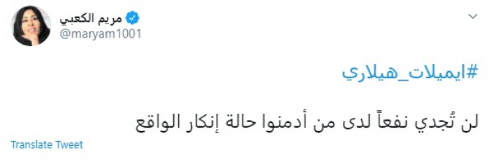وقالت في تغريدة عبر "تويتر" رصدها "المشهد العربي": "إيميلات هيلاري لن تُجدي نفعاً لدى من أدمنوا حالة إنكار الواقع".
