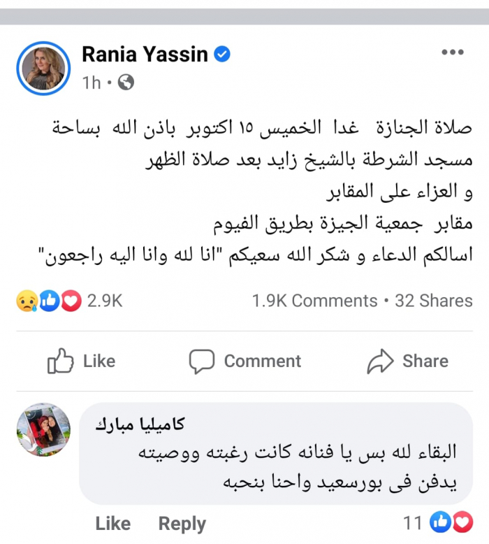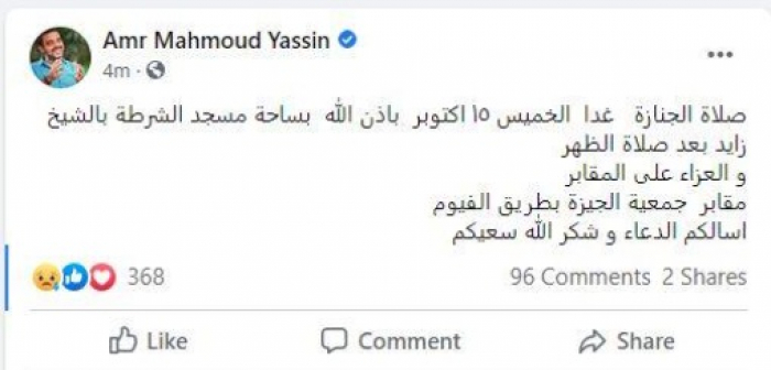 وكتب: "صلاة الجنازة غدا الخميس ١٥ اكتوبر بإذن الله بساحة مسجد الشرطة بالشيخ زايد بعد صلاة الظهر، والعزاء على المقابر، مقابر جمعية الجيزة بطريق الفيوم أسالكم الدعاء وشكر الله سعيكم".