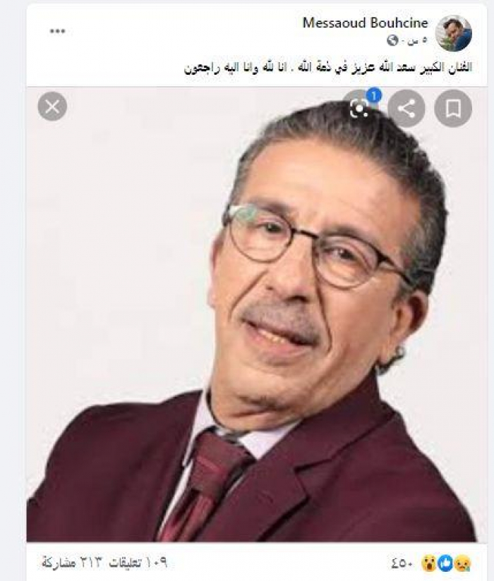وكتب "بوحسين"، عبر حسابه بموقع "فيسبوك": "الفنان الكبير سعد الله عزيز في زمة الله".