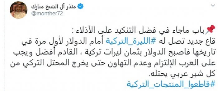 بعد تهاوي الليرة.. منذر آل الشيخ يُطالب باستمرار مقاطعة منتجات تركيا