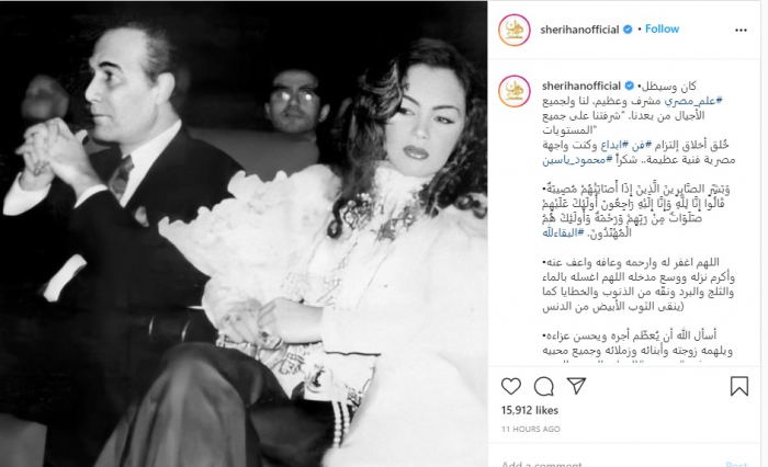 حرصت الفنانة شيريهان على نعي الفنان الكبير محمود ياسين، الذي رحل في الساعات الأولى من صباح اليوم.
