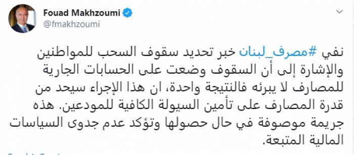 وقال في تغريدة عبر "تويتر" رصدها "المشهد العربي": "نفي مصرف لبنان خبر تحديد سقوف السحب للمواطنين والإشارة إلى أن السقوف وضعت على الحسابات الجارية للمصارف لا يبرئه فالنتيجة واحدة، إن هذا الإجراء سيحد من قدرة المصارف على تأمين السيولة الكافية للمودعين".
