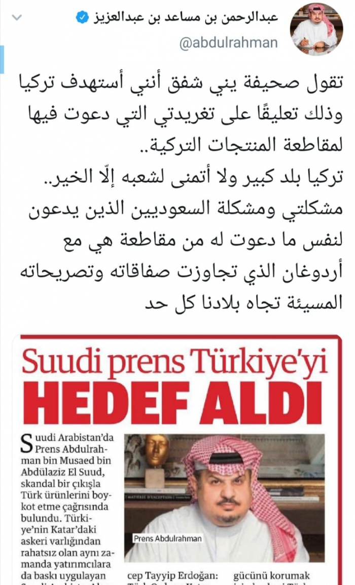 وكتب بن مساعد بن عبدالعزيز في تغريدة له عبر "تويتر" رصدها "المشهد العربي" مستشهدا بخبر صحفي: "تقول صحيفة يني شفق أنني استهدف تركيا وذلك تعليقًا على تغريدتي التي دعوت فيها لمقاطعة المنتجات التركية".