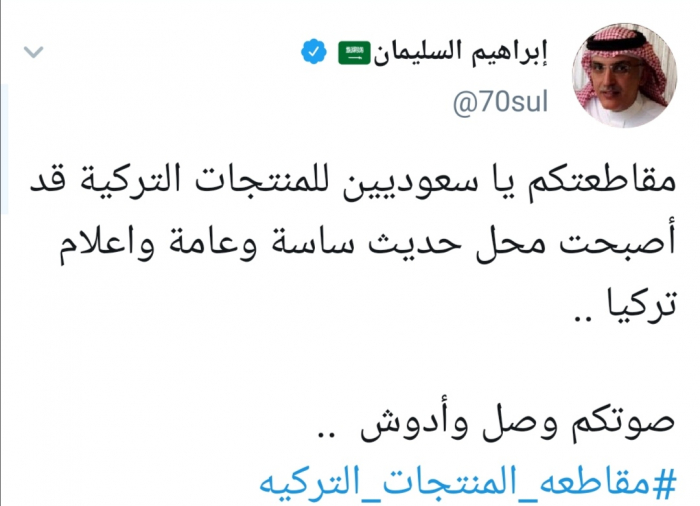 وكتب السليمان في تغريدة له عبر "تويتر" رصدها "المشهد العربي":" مقاطعتكم يا سعوديين للمنتجات التركية قد أصبحت محل حديث ساسة وعامة وإعلام تركيا".