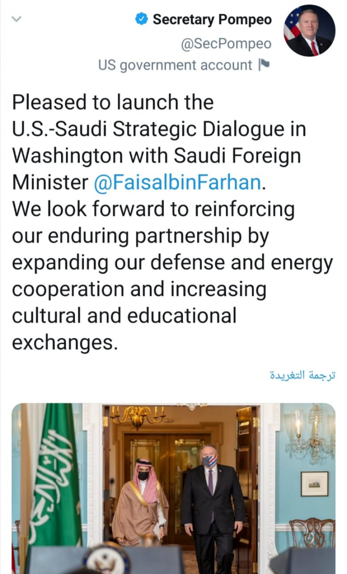 وكتب بومبيو عبر حسابه بتويتر ورصدها "المشهد العربي" :"يسعدني إطلاق الحوار الاستراتيجي الأمريكي السعودي في واشنطن مع وزير الخارجية السعودي".
