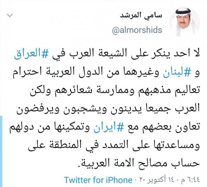 استنكر المحلل السياسي السعودي سامي المرشد، محاولة الشيعة العرب نصرة ملالي إيران على حساب مصالح بلادهم.