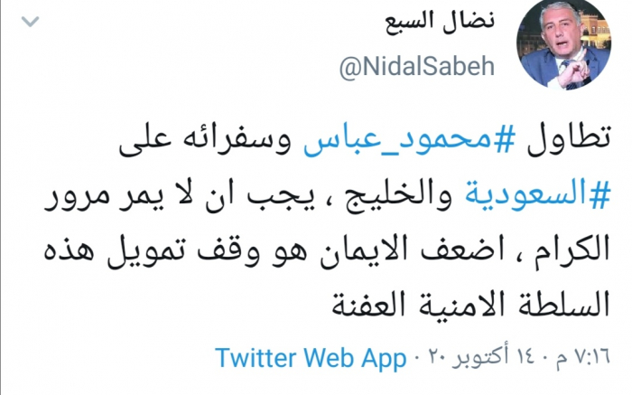 وكتب السبع في تغريدة عبر "تويتر" رصدها "المشهد العربي": "تطاول محمود عباس وسفرائه على السعودية والخليج يجب أن لا يمر مرور الكرام، أضعف الإيمان هو وقف تمويل هذه السلطة الأمنية العفنة".