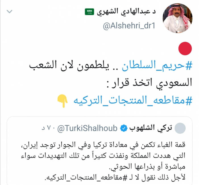 وقال الشهري في تغريدة له عبر حسابه بتويتر ورصدها "المشهد العربي": "حريم السلطان يلطمون لأن الشعب السعودي اتخذ قرار #مقاطعه_المنتجات_التركيه".