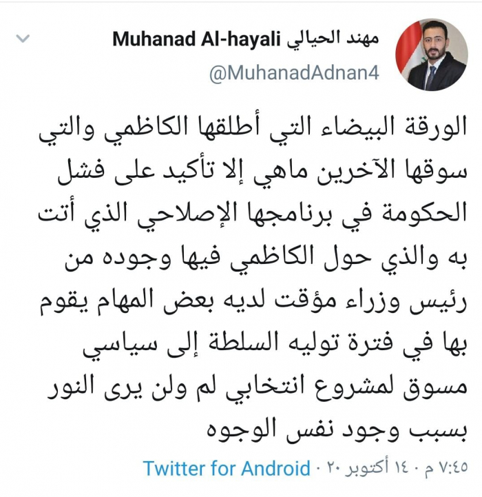 وكتب الحيالي في تغريدة له عبر حسابه بتويتر ورصدها "المشهد العربي" : "الورقة البيضاء التي أطلقها الكاظمي والتي سوقها الآخرين ماهي إلا تأكيد على فشل الحكومة في برنامجها الإصلاحي الذي أتت به".