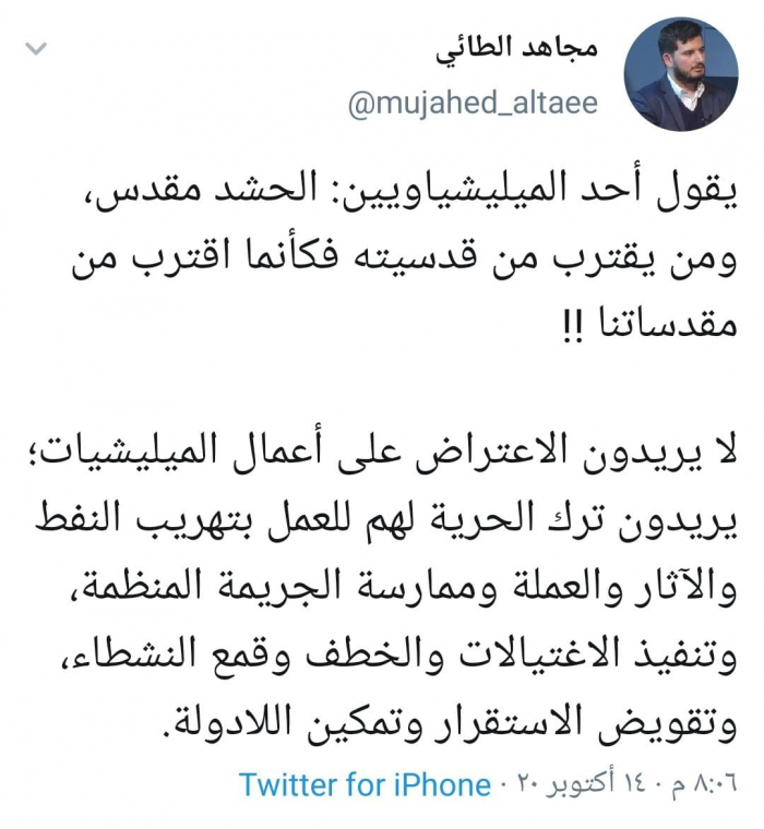 وأضاف الطائي في تغريدة له عبر حسابه بتويتر ورصدها "المشهد العربي" :" لا يريدون الاعتراض على أعمال الميليشيات؛ يريدون ترك الحرية لهم للعمل بتهريب النفط والآثار والعملة وممارسة الجريمة المنظمة، وتنفيذ الاغتيالات والخطف وقمع النشطاء، وتقويض الاستقرار وتمكين اللادولة".