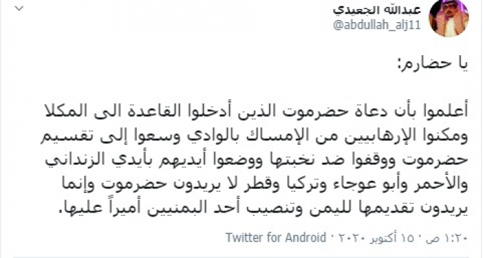 وكتب "الجعيدي" تغريدة عبر تويتر، رصدها "المشهد العربي": "يا حضارم.. أعلموا بأن دعاة حضرموت الذين أدخلوا القاعدة إلى المكلا ومكنوا الإرهابيين من الإمساك بالوادي وسعوا إلى تقسيم حضرموت ووقفوا ضد نخبتها ووضعوا أيديهم بأيدي الزنداني والأحمر وأبو عوجاء وتركيا وقطر، لا يريدون حضرموت وإنما يريدون تقديمها لليمن وتنصيب أحد اليمنيين أميرًا عليها".