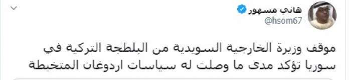 وكتب " مسهور" تغريدة عبر تويتر، رصدها "المشهد العربي": "موقف وزيرة الخارجية السويدية من البلطجة التركية في سوريا تؤكد مدى ما وصلت له سياسات أردوغان المتخبطة".