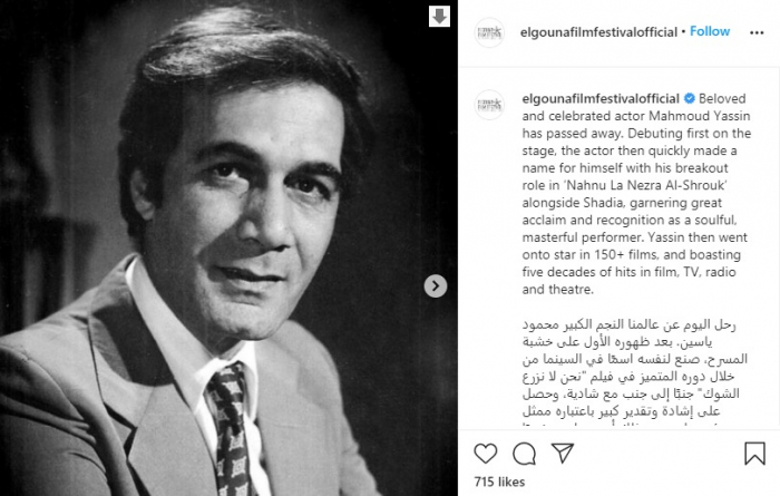 ونشرت الصفحة الرسمية للمهرجان صورتين للراحل، مصحوبتين بالتعليق التالي :"رحل اليوم عن عالمنا النجم الكبير محمود ياسين. بعد ظهوره الأول على خشبة المسرح، صنع لنفسه اسمًا في السينما من خلال دوره المتميز في فيلم "نحن لا نزرع الشوك" جنبًا إلى جنب مع شادية، وحصل على إشادة وتقدير كبير باعتباره ممثل ومؤد بارع. بعد ذلك أصبح ياسين نجمًا في أكثر من 150 فيلمًا، وحقق نجاحات مستمرة على مدار خمسة عقود في السينما والمسرح والراديو والتليفزيون".