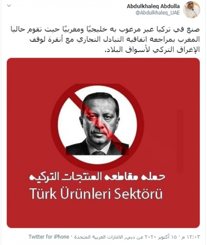 وكتب "عبد الخالق" تغريدة عبر تويتر، رصدها "المشهد العربي": "صنع في تركيا غير مرغوب به خليجيًا ومغربيًا حيث تقوم حالياً المغرب بمراجعة اتفاقية التبادل التجاري مع أنقرة لوقف الإغراق التركي لأسواق البلاد".