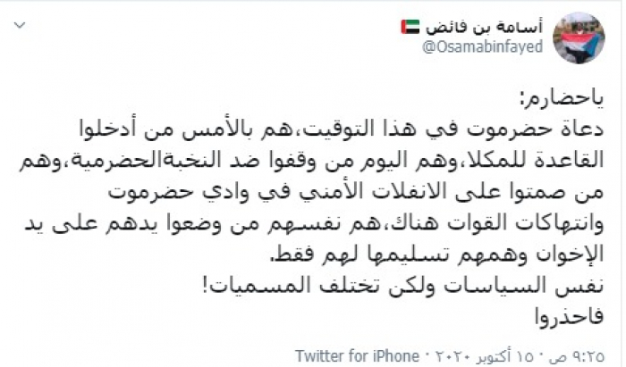 وكتب "بن فائض" تغريدة عبر تويتر، رصدها "المشهد العربي": "ياحضارم.. دعاة حضرموت في هذا التوقيت، هم بالأمس من ادخلوا القاعدة للمكلا، وهم اليوم من وقفوا ضد النخبة الحضرمية، وهم من صمتوا على الانفلات الأمني في وادي حضرموت وانتهاكات القوات هناك، هم نفسهم من وضعوا يدهم على يد الإخوان وهمهم تسليمها لهم فقط".