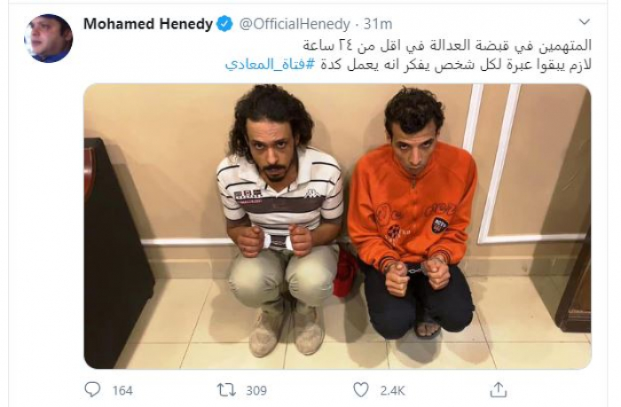 وجه الفنان محمد هنيدى، الشكر للجهات الأمنية وجهات التحقيق المصرية، لسرعة استجابتهم للواقعة وضبط المتهمين فى قضية فتاة المعادى "مريم"، وغرد هنيدى عبر حسابه على تويتر قائلا "المتهمين في قبضة العدالة في أقل من 24 ساعة لازم يبقوا عبرة لكل شخص يفكر إنه يعمل كده".