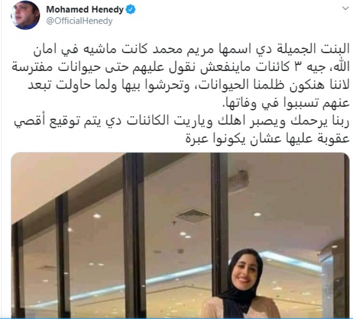 وكان هنيدي علق في تغريدة سابقة :" البنت الجميلة دي اسمها مريم محمد كانت ماشيه في امان الله، جيه ٣ كائنات ماينفعش نقول عليهم حتى حيوانات مفترسة لاننا هنكون ظلمنا الحيوانات، وتحرشوا بيها ولما حاولت تبعد عنهم تسببوا في وفاتها"..