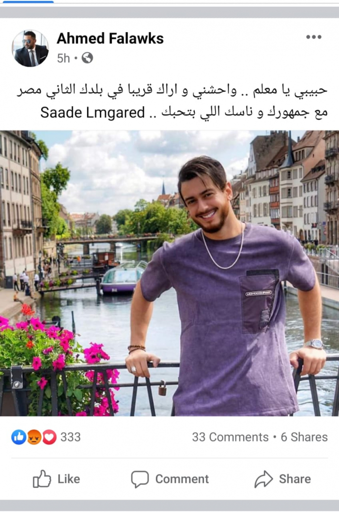ونشر فلوكس صورة لسعد لمجرد عبر حسابه بموقع "انستجرام"، معلقا عليها :"حبيبي يا معلم .. واحشني و اراك قريبا في بلدك الثاني مصر مع جمهورك و ناسك اللي بتحبك".