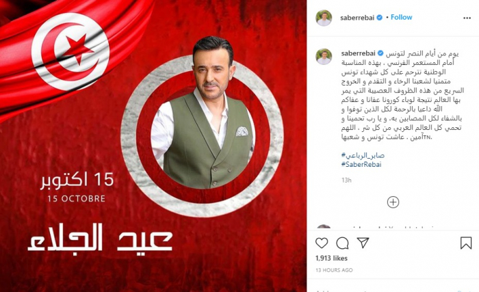 احتفل الفنان صابر الرباعي بعيد الجلاء لتونس و نشر صورة جديدة له و ذلك عبر حسابه الشخصي علي موقع تبادل الصور و الفيديوهات " انستجرام".