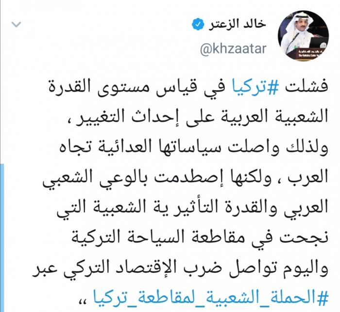 وأشار الزعتر إلى أن تركيا "اصطدمت بالوعي الشعبي العربي وقدرة التأثير الشعبي الذي نجح في مقاطعة السياحة التركية واليوم يواصل ضرب الاقتصاد التركي".